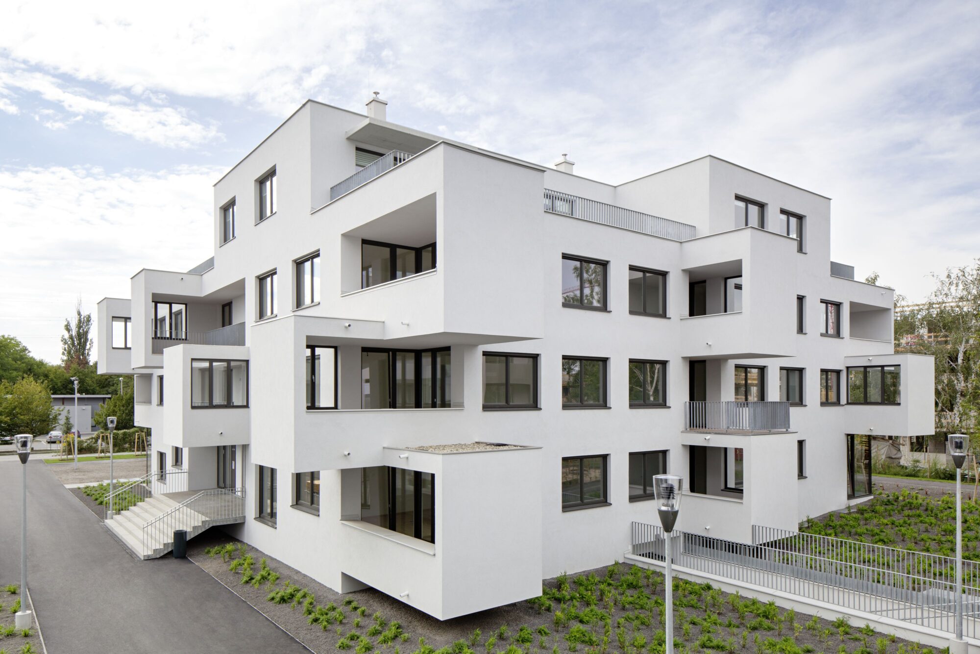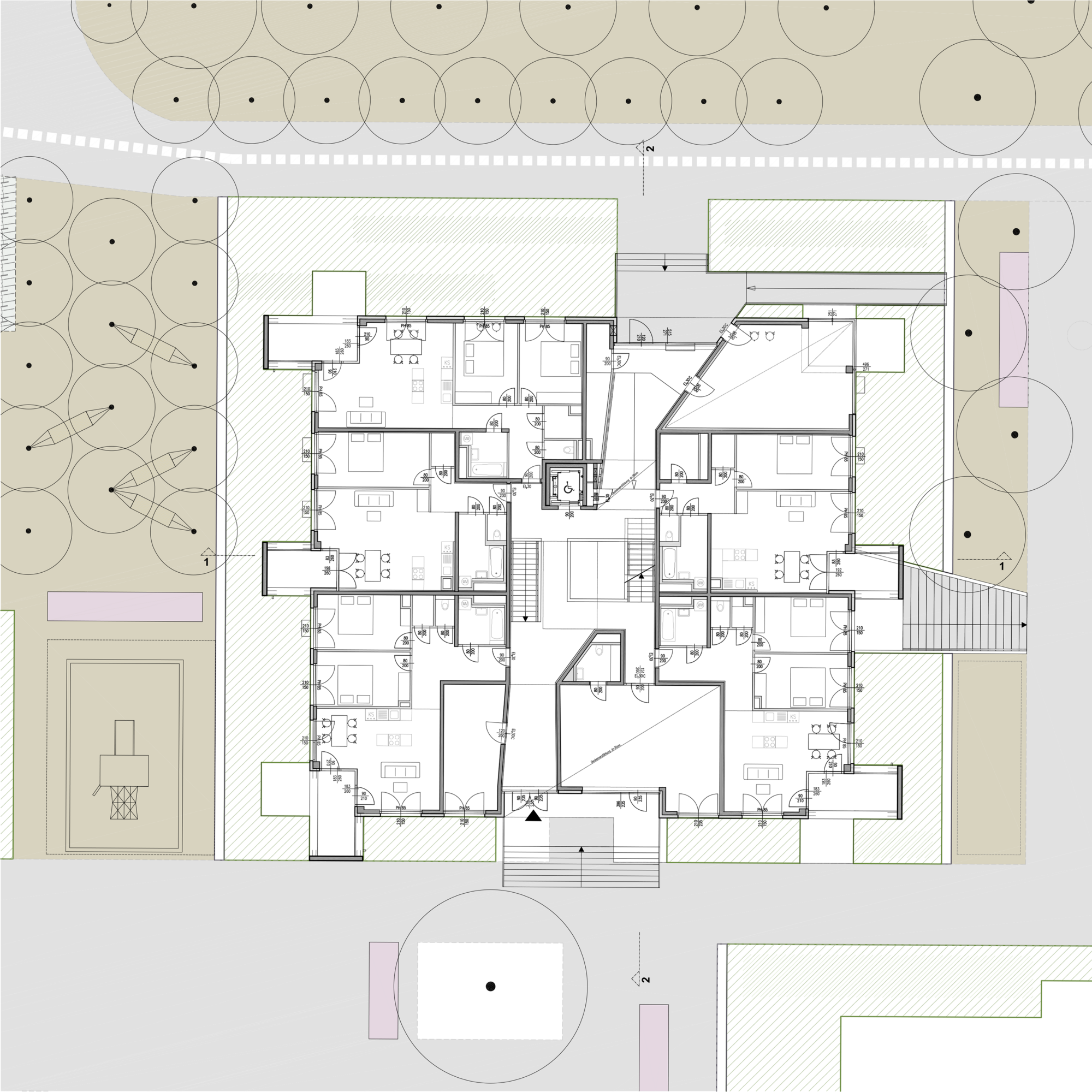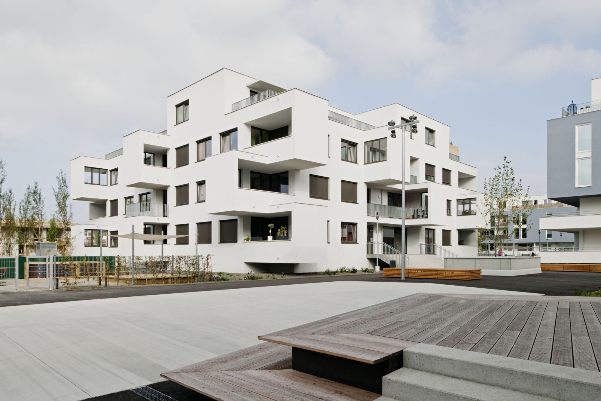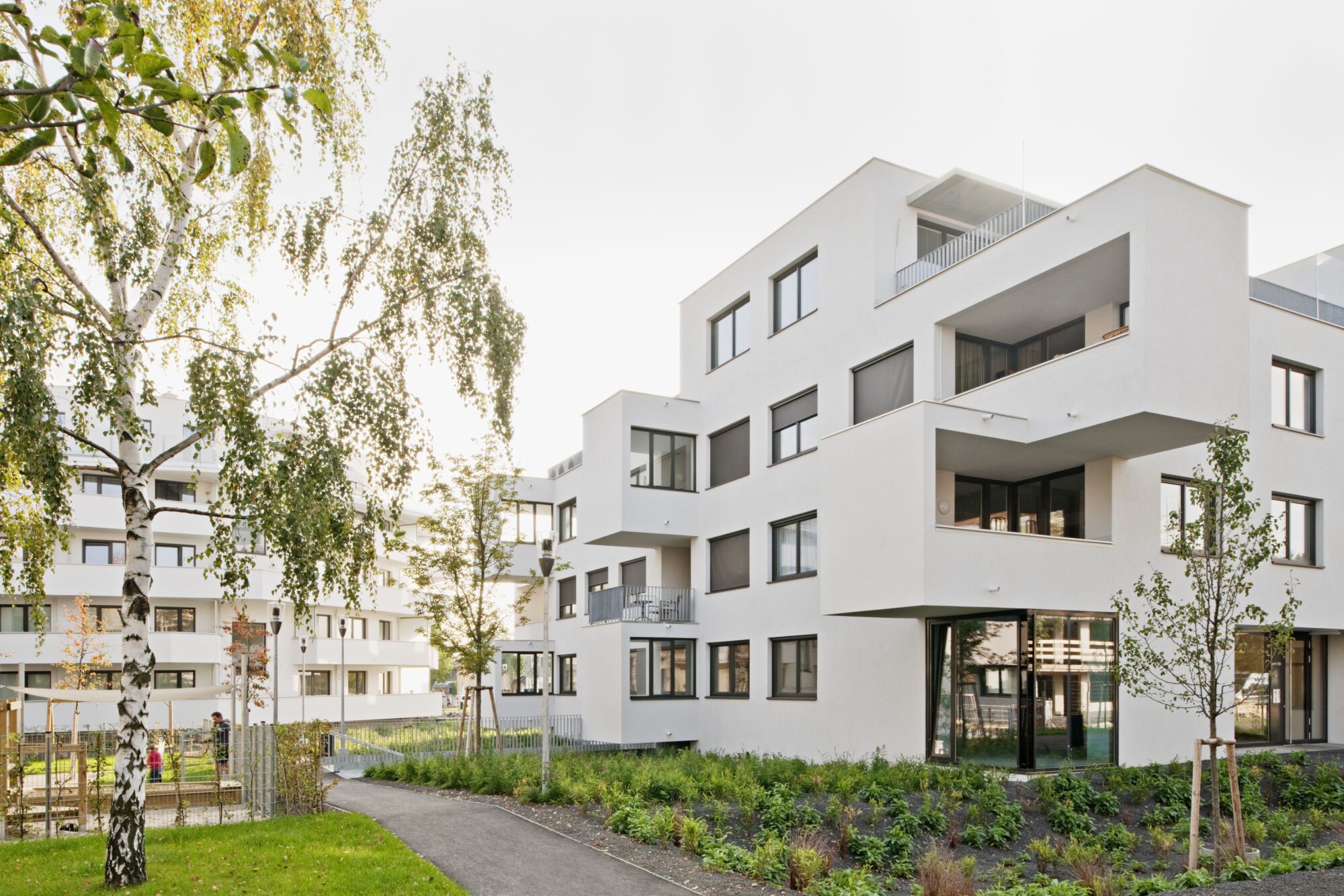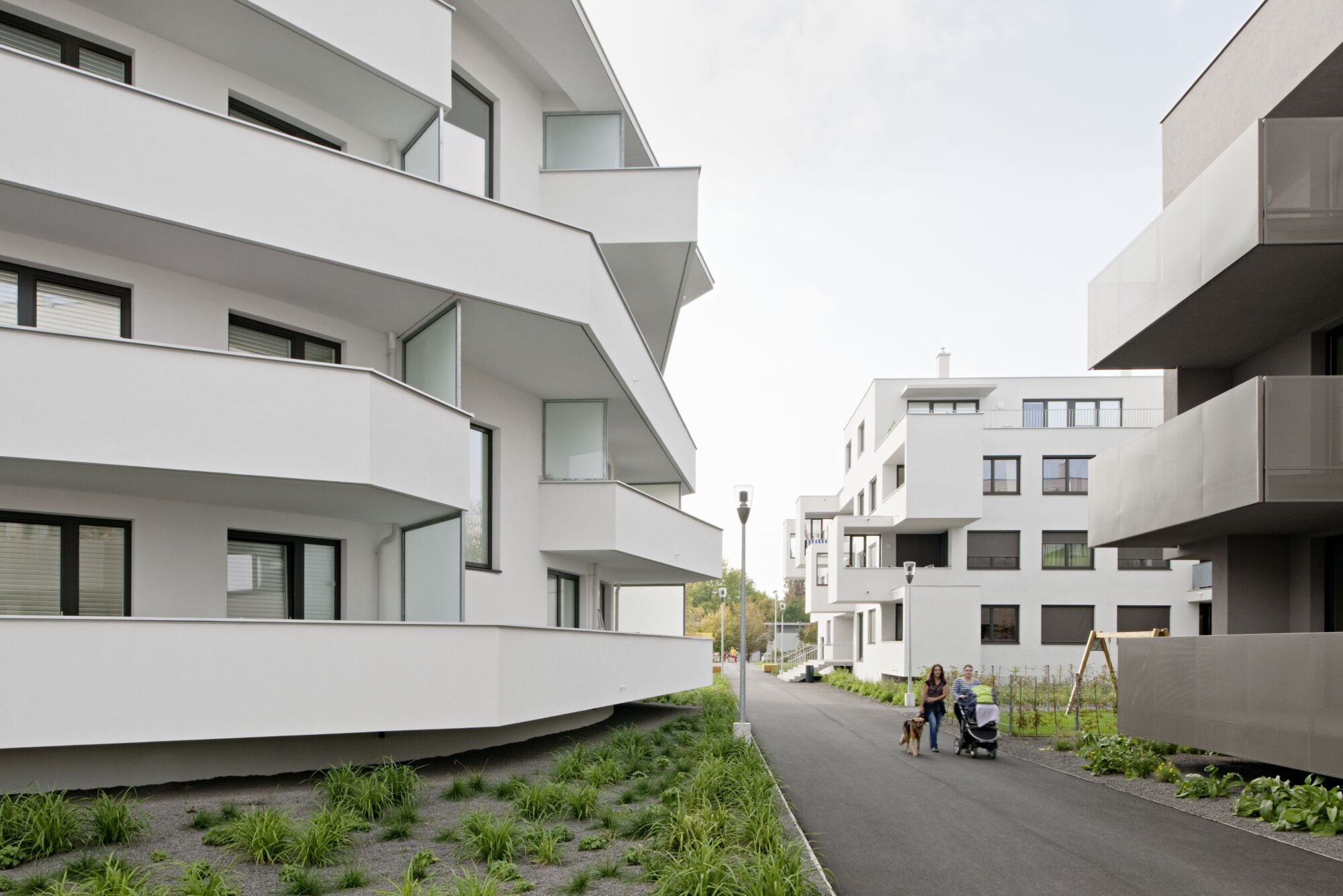 Die Anlage besteht aus 9 Punkthäusern. Die ursprünglichen, von der Widmung vorgegebenen fünf Baukörper wurden um weitere vier in nahezu gleicher Dimension ergänzt. Das ergibt Zwischenzonen, Durchgangsmöglichkeiten, Offenheit, keine Barriere durch die Bebauung. Die Öffnung zu den neuen Siedlungsgebieten in der Umgebung war uns wichtig.