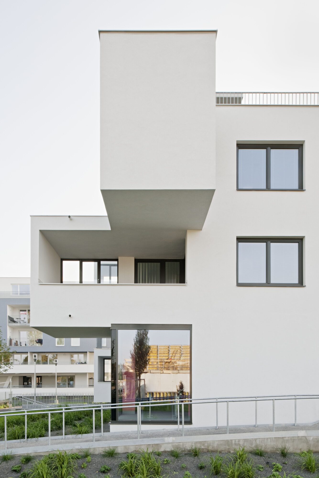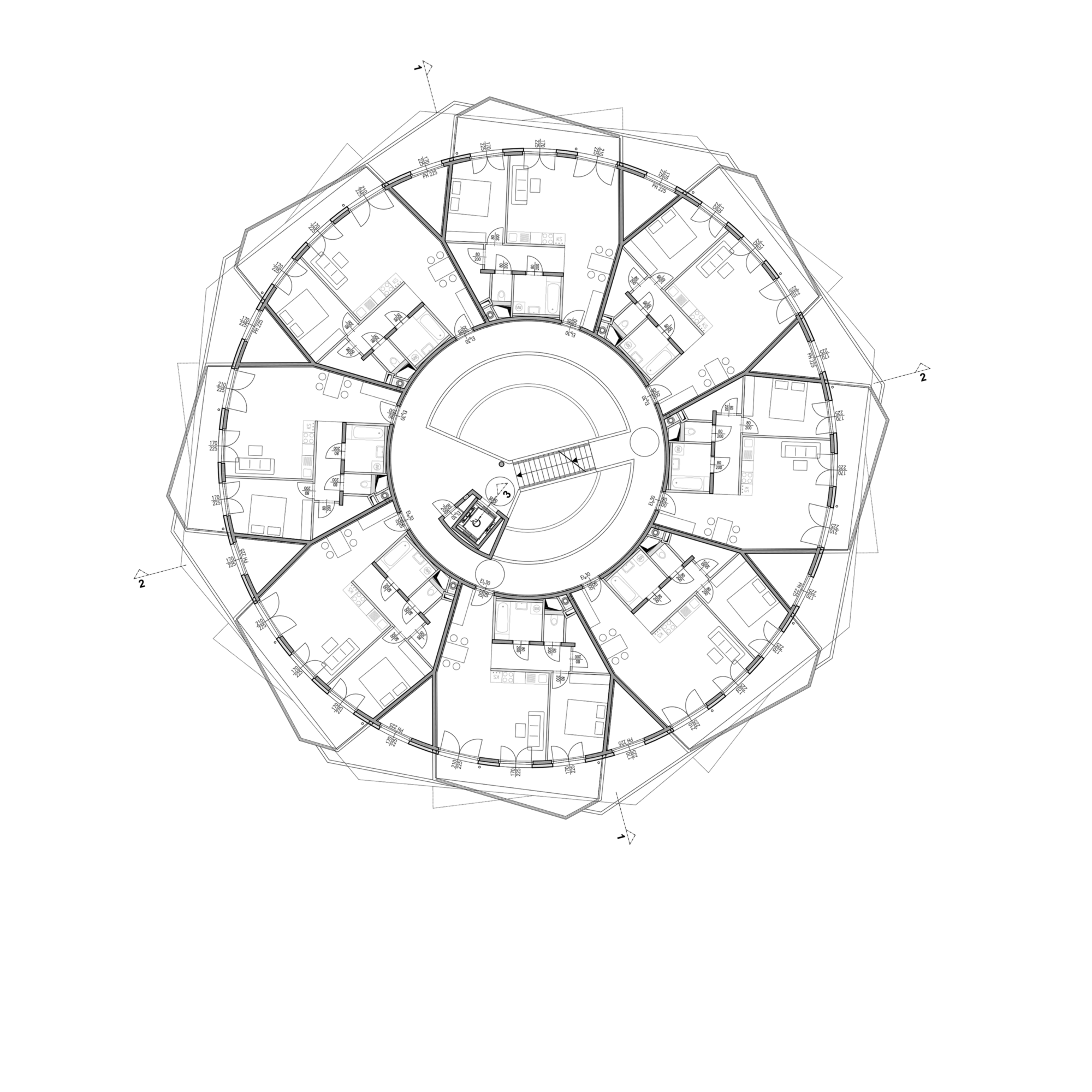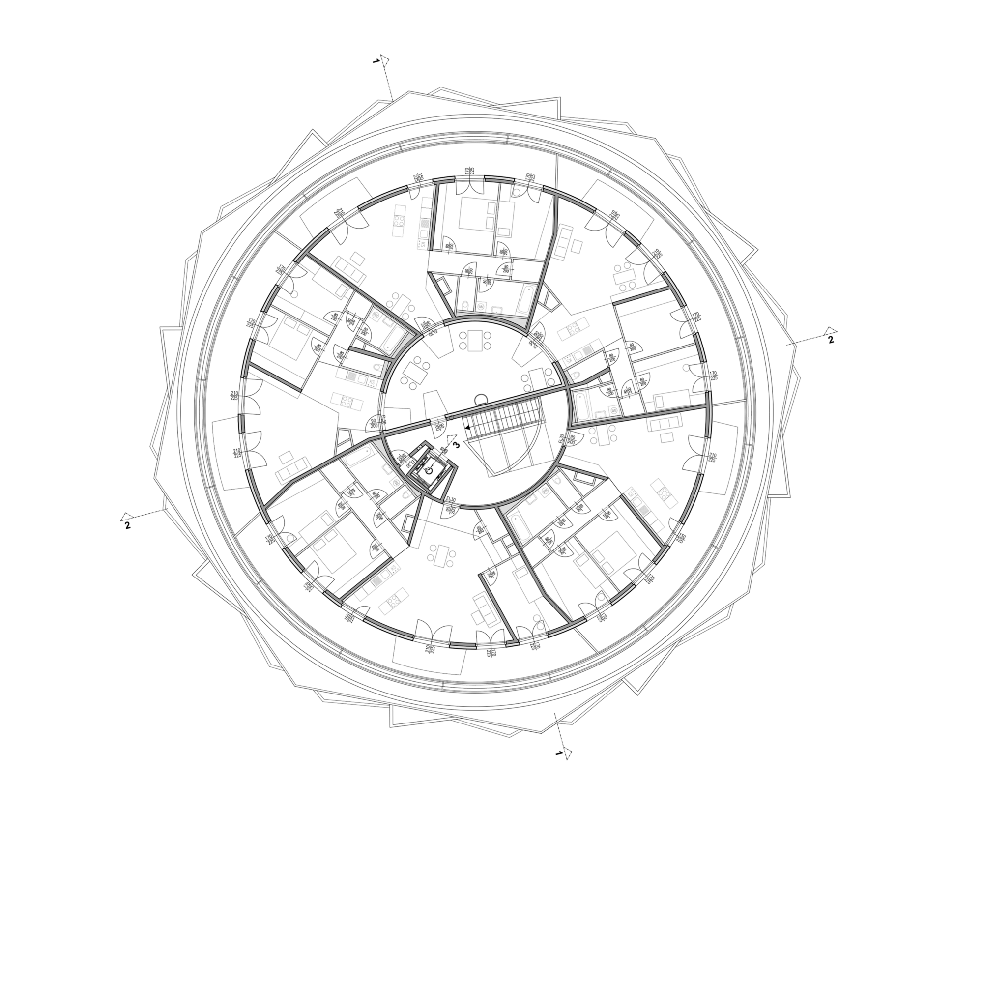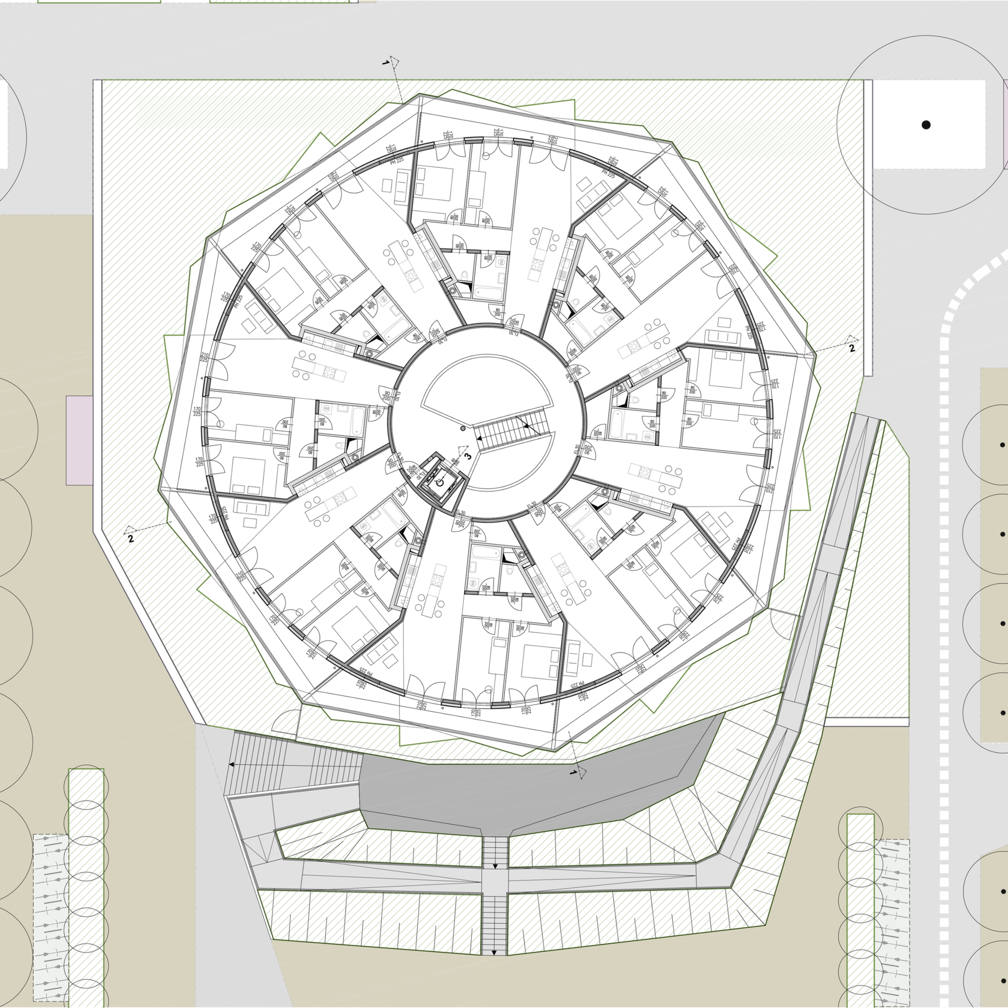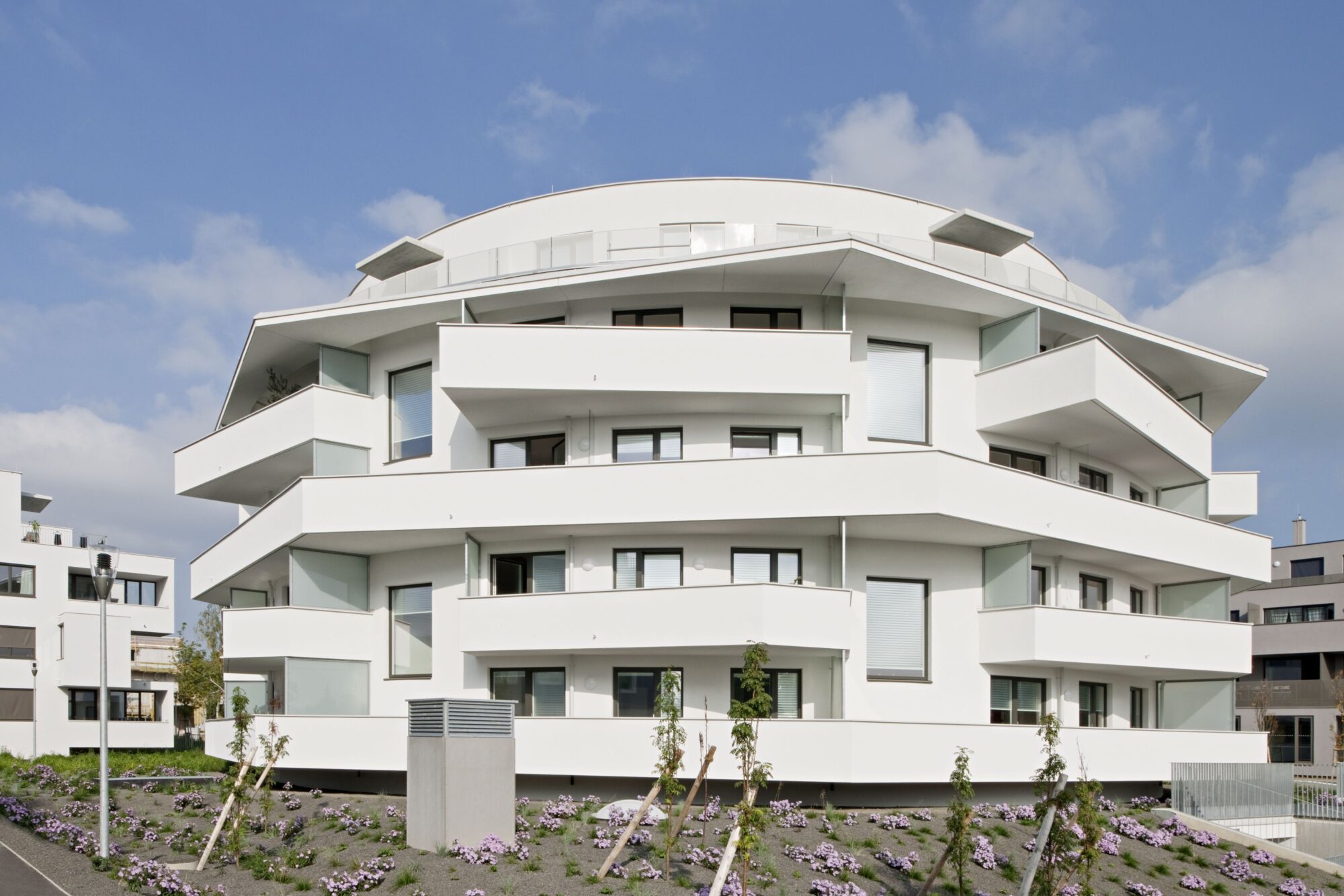 Die Anlage besteht aus 9 Punkthäusern. Die ursprünglichen, von der Widmung vorgegebenen fünf Baukörper wurden um weitere vier in nahezu gleicher Dimension ergänzt. Das ergibt Zwischenzonen, Durchgangsmöglichkeiten, Offenheit, keine Barriere durch die Bebauung. Die Öffnung zu den neuen Siedlungsgebieten in der Umgebung war uns wichtig.