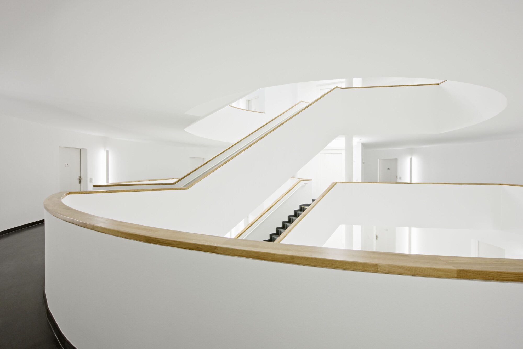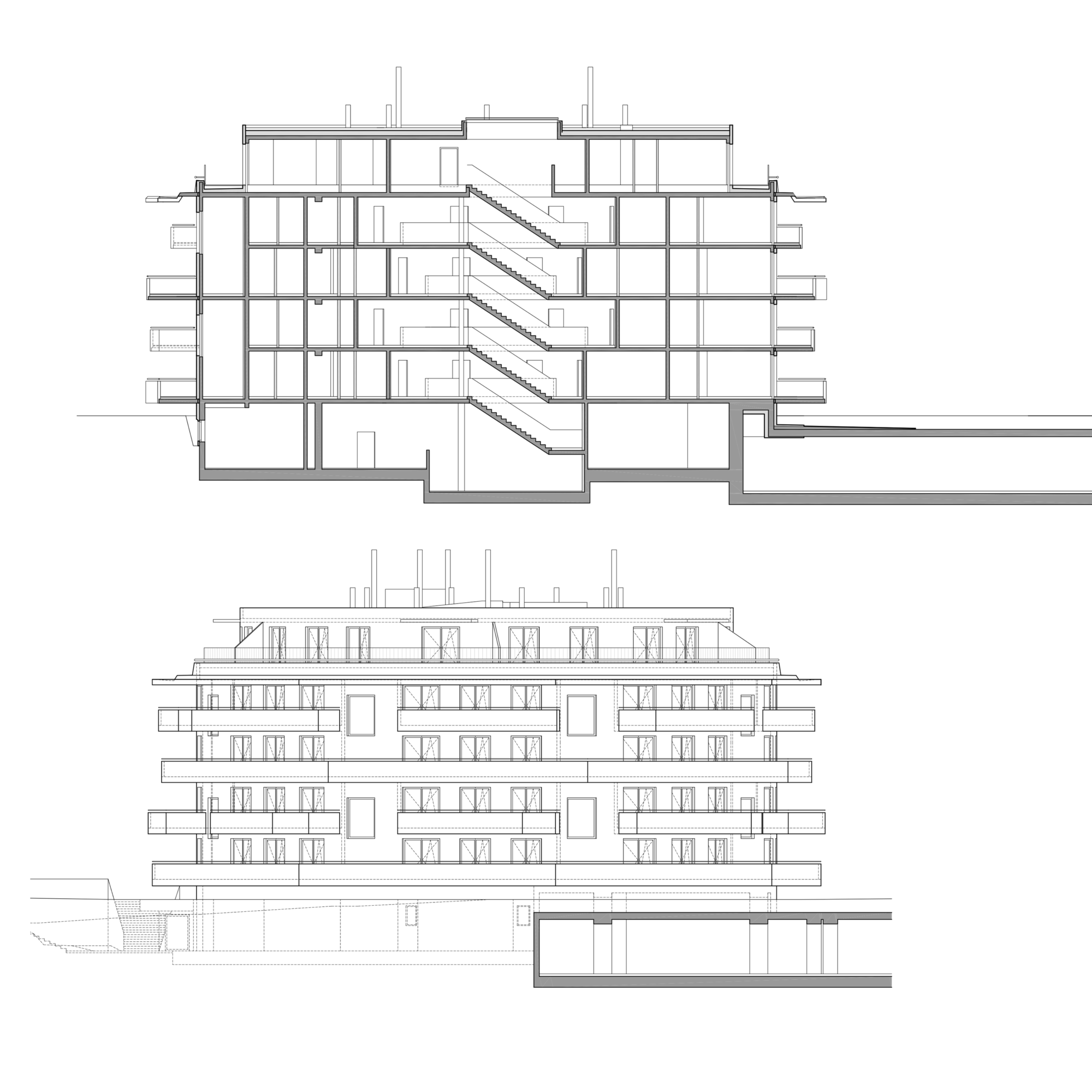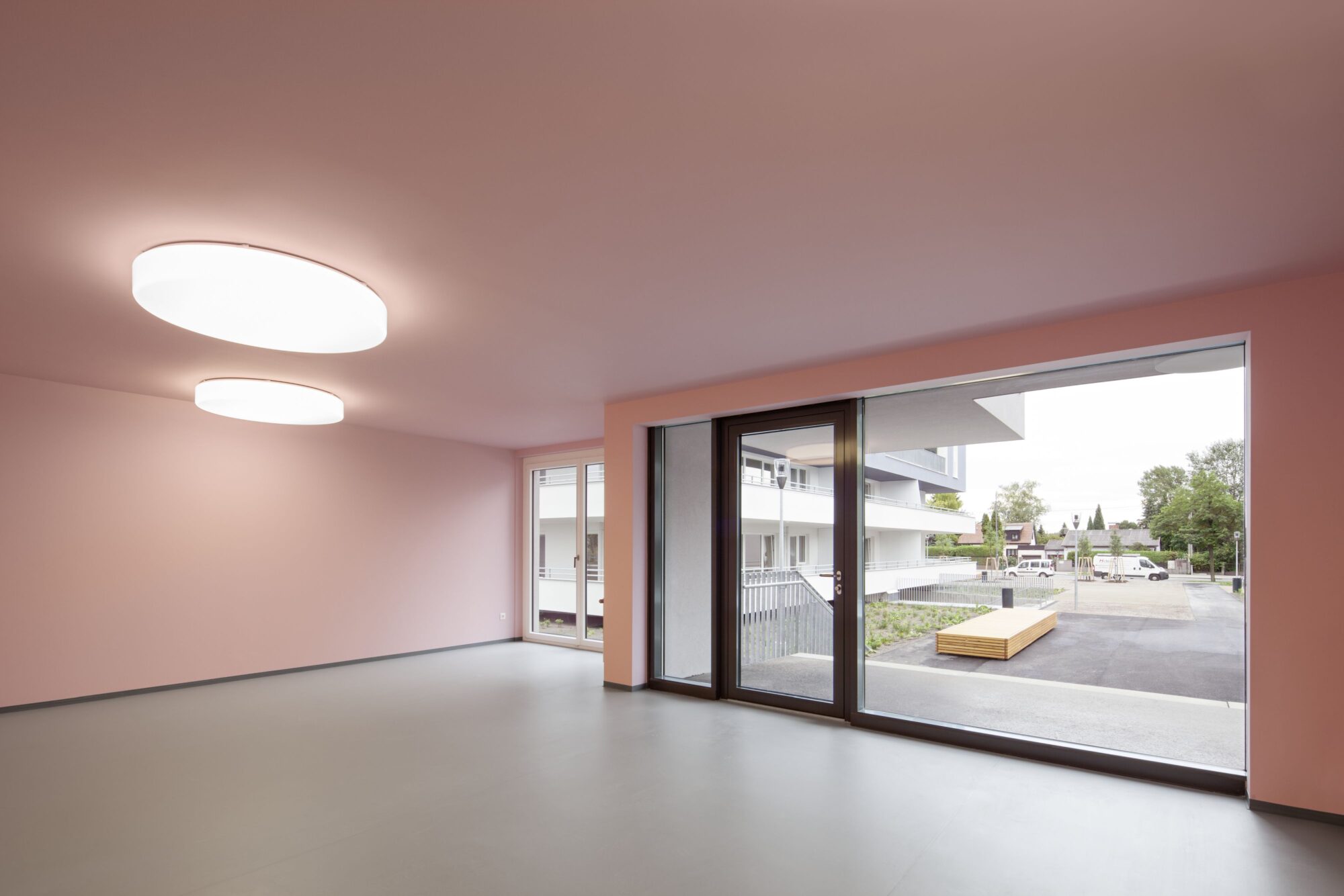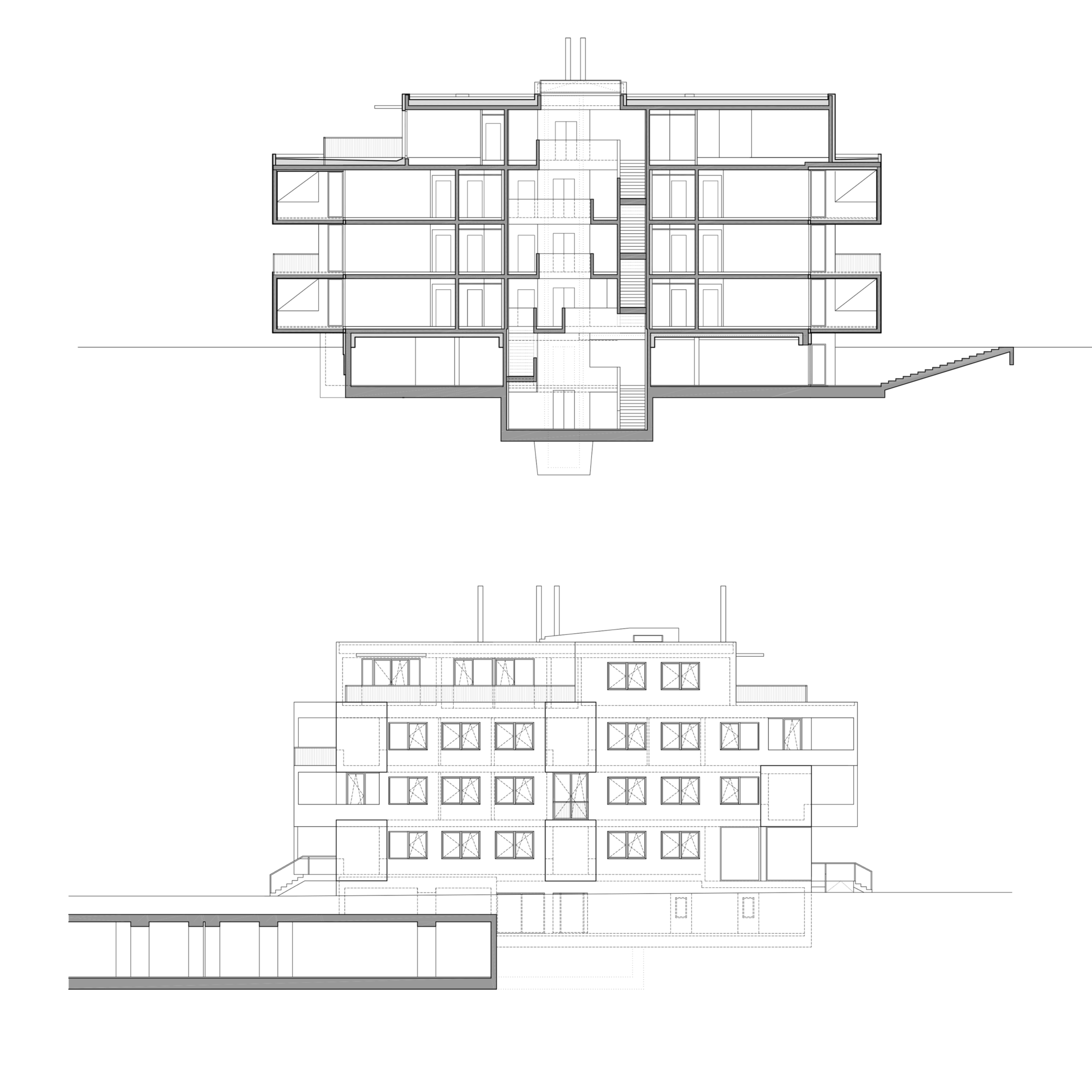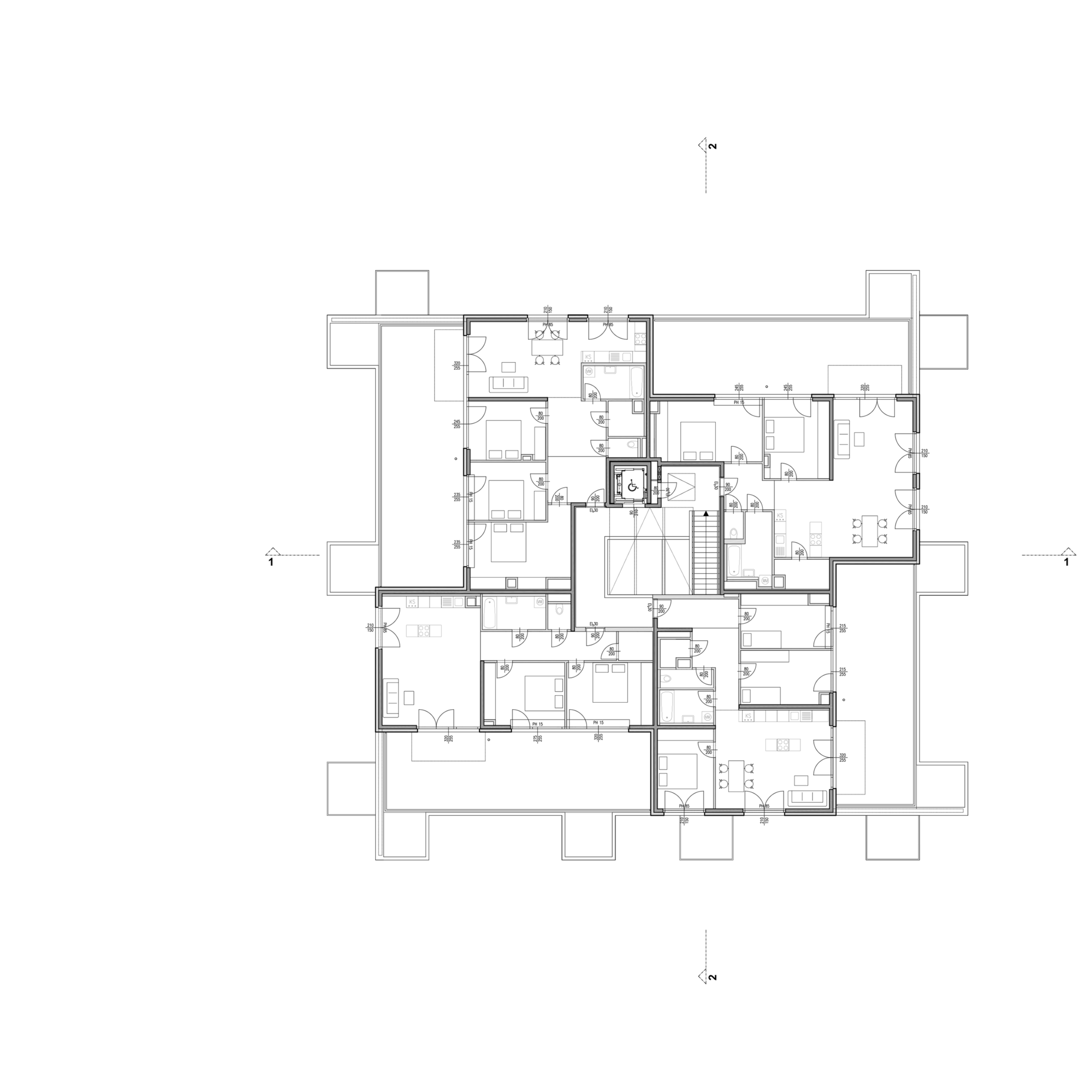 Die Anlage besteht aus 9 Punkthäusern. Die ursprünglichen, von der Widmung vorgegebenen fünf Baukörper wurden um weitere vier in nahezu gleicher Dimension ergänzt. Das ergibt Zwischenzonen, Durchgangsmöglichkeiten, Offenheit, keine Barriere durch die Bebauung. Die Öffnung zu den neuen Siedlungsgebieten in der Umgebung war uns wichtig.